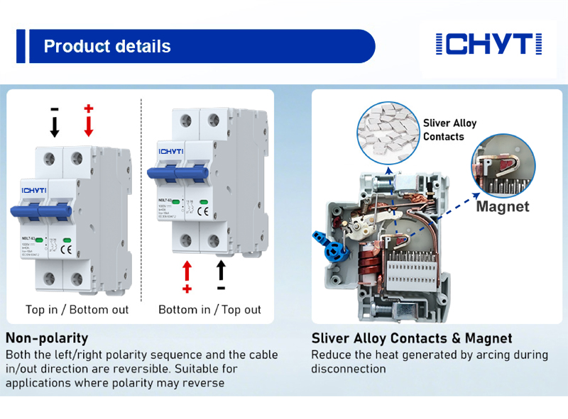 सौर आपूर्तिकर्ताओं के लिए चीन ICHYTI डीसी एमसीबी डीसी सर्किट के लिए उपयुक्त है, जिसमें 1000V का रेटेड वोल्टेज और 63A तक का रेटेड करंट है, जो ओवरलोड और शॉर्ट सर्किट से सुरक्षा प्रदान करता है। इसके अलावा, इस उपकरण का उपयोग संचार और फोटोवोल्टिक प्रणालियों जैसे डीसी लाइनों के कम-आवृत्ति संचालन के लिए भी किया जा सकता है।