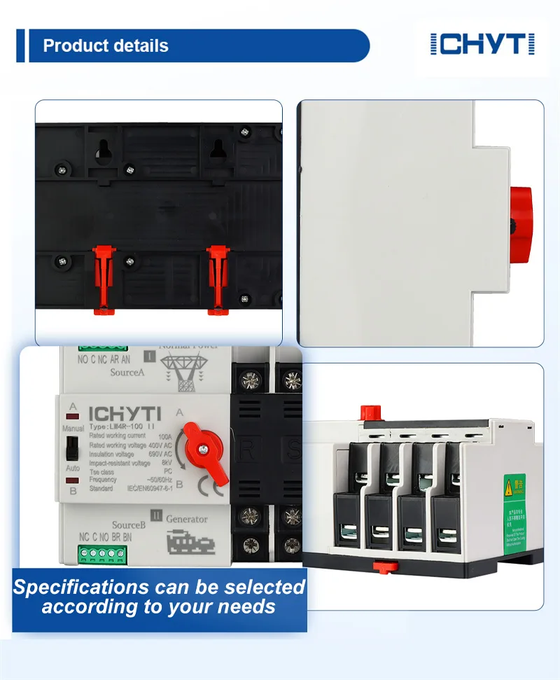 चीन फैक्टरी ICHYTI थोक खरीदें डिस्काउंट सिंगल चरण स्वचालित चेंजओवर स्विच में तीन-चरण चार तार पावर ग्रिड की बिजली आपूर्ति प्रणाली में तीन स्विचिंग फ़ंक्शन हैं, जिसमें स्टैंडबाय बिजली आपूर्ति, बैकअप पावर आपूर्ति और पावर ग्रिड और जनरेटर की स्वचालित स्विचिंग शामिल है। यह वास्तविक समय में तीन-चरण वोल्टेज प्रभावी मूल्य और चरण वोल्टेज प्रभावी मूल्य और दो बिजली स्रोतों के चरण का पता लगा सकता है, और किसी भी चरण में ओवरवॉल्टेज, अंडरवॉल्टेज या चरण हानि के मामले में स्वचालित रूप से असामान्य बिजली स्रोतों से सामान्य बिजली स्रोतों पर स्विच कर सकता है।
